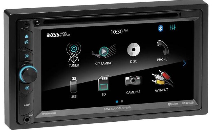 If you’re looking for a touchscreen car stereo that offers a lot for your hard-earned dough, the Boss Audio BV9695B DVD receiver fits the bill. Its 6.95″ display includes a variable color background, simple icon controls for your DVD, CD, microSD, and USB sources, and built-in Bluetooth®. If you’re an Android user, plug in via USB and mirror your phone’s screen on the display